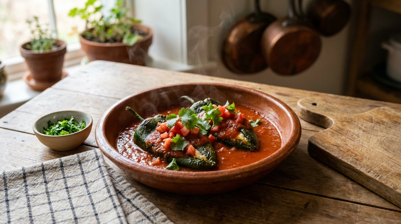 ¡Hola! Vamos a preparar un clásico de la cocina mexicana: chiles rellenos de queso en caldillo rojo tradicional. Este platillo combina el sabor ahumado del chile poblano con un relleno cremoso de queso y una salsa de jitomate casera que aporta calidez. Perfecto para una cena especial, esta receta te ofrece un plato principal delicioso y reconfortante que puede acompañarse con arroz y tortillas para una comida completa.